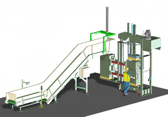 A weighing and filling system WVS can be used to quickly load a cart or a pressing box with a preset load of used clothing. This is only usefull for crush-packed goods. It consists of a horizontal weighing belt and a slanting feeding belt with a pneumatic prepress.