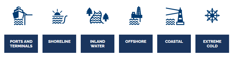 Constructed from vulcanised neoprene rubber, the boom is generally laid in a "J" formation to corral and recover oil in one operation. The wide oil collection mouth can span up to 200m, making it ideal for large spills at sea.