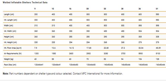MFC international’s range of inflatable shelters can be set up in a matter of minutes, and will stay standing without continuous inflation. With no mechanical framework the shelters are lighter and more compact once packed. All shelters are supplied with removable end panels and adjustable zipped entrances at the front and rear, providing a versatile solution that allows two or more shelters to be linked together if required. Shelters can be anchored on hard or soft standing, and guy ropes are provided for use in inclement weather.