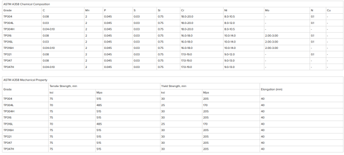 ASTM A358: American Society `or Testing and Materials. Elelric-Fushion-Welded Austenitic Chromium-Nickel Stainless Steel Pipe For High-Temperature Service and General Applications. Application: Refineries: Nuclear Plant: Aerospace Industry: Chemical Fertilizer: Petrochemicals` Oli & Gas and etc.