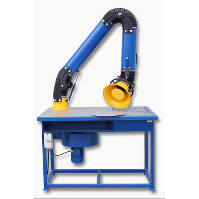 S-1000 welding table is a work station equipped with air pollution capture and exhaust devices which appear with workshop processes (especially during welding). S-1000 table frame, made of heavy duty square profiles, features built-in downdraft exhaust, fume arm connection inlet and ZWR-03 aluminium radial impeller fan unit. Downdraft exhaust and fume arm individual dampers allow airflow adjustments as fan unit transports air pollution to the outside of premises (discharge installation must be connected). Surface of the S-1000 welding table has been coated with conductive corrosion protection and grounding table can be connected on left or right side of the table frame. S-1000 welding table complete sets are offered with revolving table for more productive work on smaller elements.