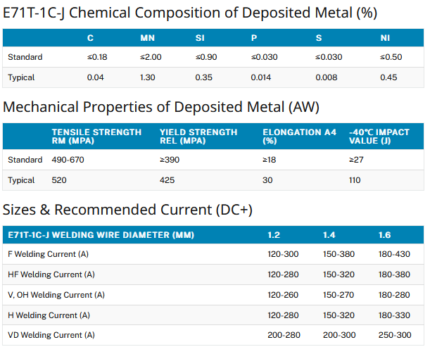 E71T-1C-J welding wire is used for welding structures fabricated by mild steels and 490MPa grade high tensile strength steels, such as ships, offshore platforms, pressure vessels, pipes and so on. The weld metal has good plasticity and low temperature impact toughness.