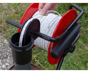 The 105 Well Casing and Depth Indicator uses corrosion and chemical-resistant flat tape. The tape is non-stretch and high in tensile strength to support the heavier 105 Probe. The thick dog bone design prevents adherence to wet surfaces and allows the tape to hang straight. It is also easy to repair and splice. The 3/8" (10 mm) tape comes with permanent laser markings every 1/100 ft. or each millimeter, in lengths up to 2000 ft. (600 m).