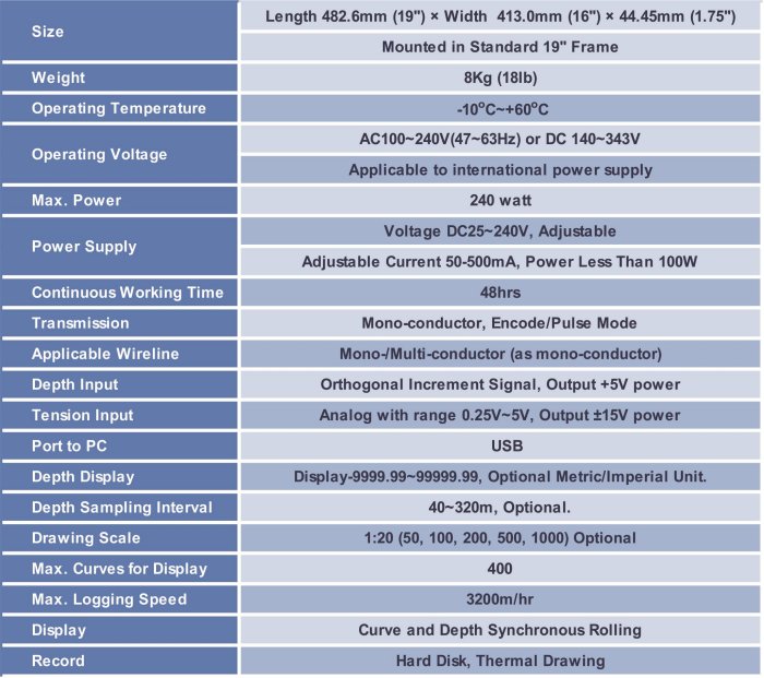 The Portable Data Acquisition System (DAS) 1U is a highly integrated portable data acquisition unit, which integrates the DC Power function etc. in the 19" 1U unit. The unit is connectable to PC via a USB Port to supply power to the downhole tools, acquire and process the tool data, acquire depth and tension data, and to transmit commands from the surface to downhole tools.