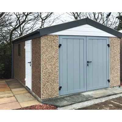When the concrete wall panels are removed from their moulds they are left for another seven days to mature. They are then ready to assemble creating a garage or garden building to your required size and wall finish. These wall panels are tongued and grooved which allows them to fit together with a good watertight seal. This results in a building that structurally and visually can more than equal traditional brick and roughcast structures. From a cost point of view they are substantially less expensive than traditional structures.