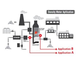 The limestone and gypsum slurry density meter can be applied at desulfurization process. The density meter of Application A is installed to control the density pumping from a mill slurry tank. The density meter of Application B is installed to monitor the density of gypsum slurry circulation at desulfurization process.