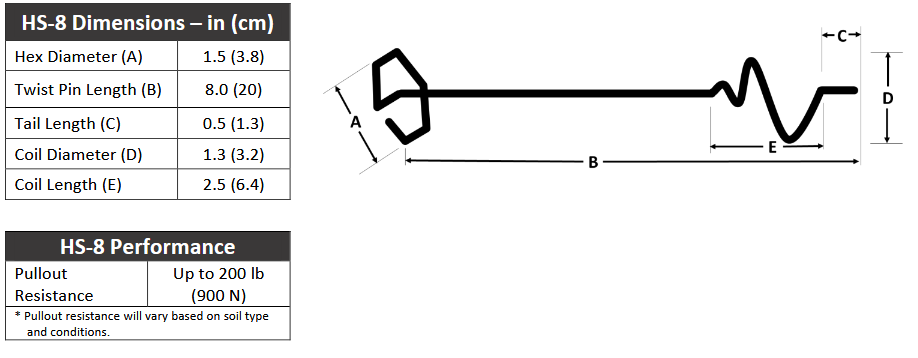 Falcon Hex Pins show superior pullout resistance compared to standard fasteners. Pullout resistance will vary based on soil type. A pullout test should be conducted to verify in-situ stability. A minimum 20 lbs of pullout resistance is required for use with rolled erosion control products. HS-8 pins are optimized for loose, sandy and silty type sols.