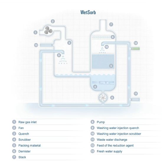 After the oxidation of for example halogenated hydrocarbons, the corresponding hydrogen halides and elemental halogens emerge. Inorganic pollutants are efficiently removed from the waste gas by wet gas purification. The combination of exhaust gas cooling (quench) and waste gas purification (scrubber) is ideal for use after a convential APC system.