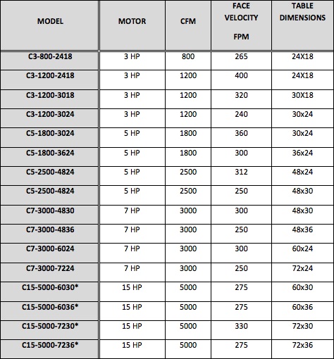 CONSTRUCTION – 10 ga galvanized 100% seam welded, POWDER COATED – Eurogray, matt – texture, WORK GRATE – 1” Fiberglass, 300 lbs uniform load capacity, FACE VELOCITY RANGES – 250 – 350 FPM, ERGONOMIC DESIGN – Allows operator to sit or stand.