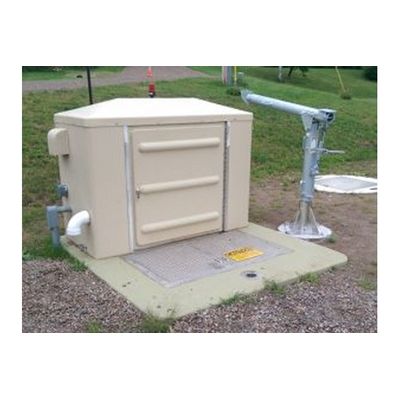 The PumpMate is a wet well, mounted, above-ground valve and control station for submersible pumps. The base is 8 inches of concrete and rebar with a double door hatch and hoist receptacle. Two large doors for easy access to the control panel and valving.