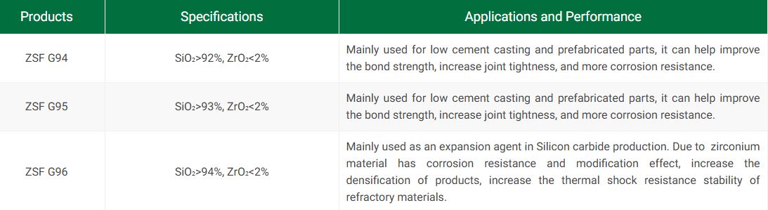 As the by-product of Zirconia, it has excellent features both in silica and zirconia, such as high SiO2 content, fine granularity, large surface area and good fluidity to enhance the wear resistance, durability and reinforcement performance in the fields of injection materials, cement and concrete, refractory, ceramics and electronic materials.