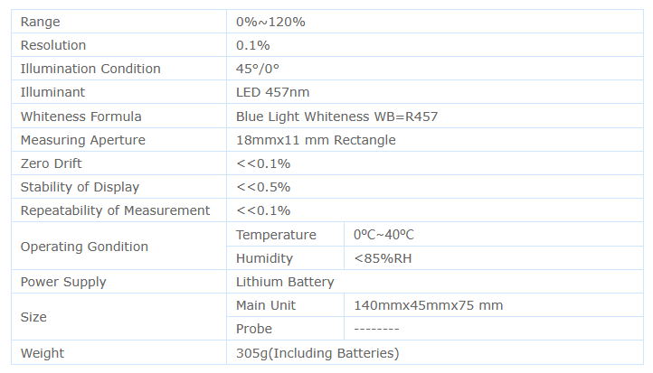 - It consists of Light Source, Optical System, Detection System, Data Process and Display System. The whiteness Calculation Formula of the instrument is blue light whiteness R457.