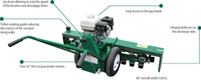 For agricultural, commercial and residential usage: barns, alleys, sidewalks, driveway, lawns, golf, rink, etc.. Honda 5.5 HP motor. . 20 heavy duty nylon brushes for lateral sweeping. . 48`` (1,2 m) sweeping width.. Light and easy to operate.