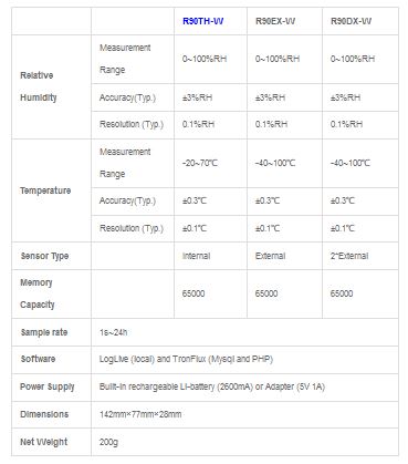 R90TH-W WiFi temperature humidity data logger adopts WiFi wireless communication which can achieve real-time multi-point monitoring and remote transmission in LAN and Internet mode. Digital LCD display, data recording and visual & audible alarm function as well as hybrid network connect to the Internet. Users can finish the setup on PC or smart phone conveniently and easily. Local download by USB or remotely via wifi fromTronFlux server. Standard package includes LogLive local software, TronFlux (with MySQL and PHP) server based software for remote monitoring, probe, AC adapter, USB cable, antennae and internal battery.