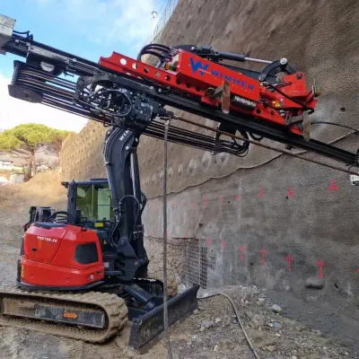 Customized high-performance drilling rigs in lightweight design. 360° endless rotation, 90° swivel. Standard: Automatic empty hammer, cavity safety device, anti-fixed drilling device and soft spot drilling - to protect drilling steel and drill bits. Lightweight, sturdy heavy-duty profile and hose reel standard. Own power supply, no electr. connections required. Radio remote control as standard, drilling functions proportionally controlled. Efficient percussion drilling up to 63 mm. Rotary drilling / downhole drilling up to 135 mm. Anchor drilling with injection up to 89 mm. Wimmer Cockpit Drilling Data Analysis.