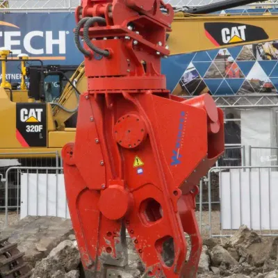Universal demolition tongs - single cylinder version. Manufactured from special wear-resistant steels. Applicable in demolition, recycling, crusher preparation. Exchangeable crusher teeth - integrated exchangeable cutting blades. High punctual refractive power at the crusher teeth. Hydraulically 360° endlessly rotatable. The special bit shape enables the separation of concrete crushing and cutting tasks without damaging the blades.