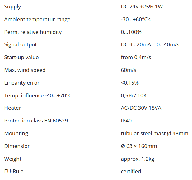 The anemometers are used for the measurement and the control of wind speed. The anemometer is protected against the atmospheric agents so that it can be used in every application field. The machine has standard heating automatically regulating and it is made of a generator of three-phase current with a rectifying link. The output tension is proportional to the revolution number in a minute and it can be used as output.