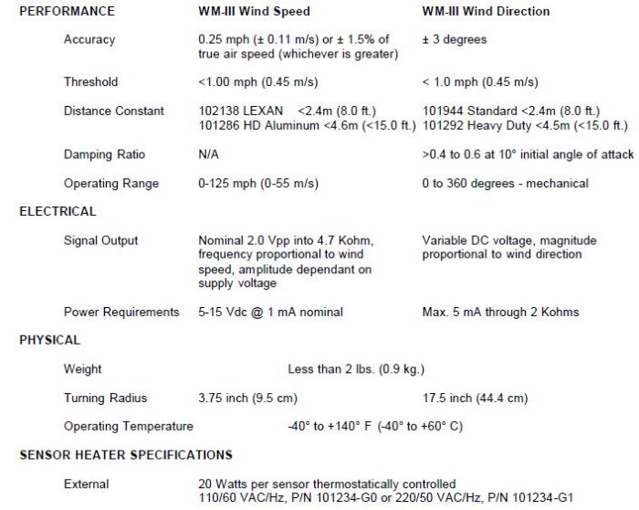 Climatronics` Wind Mark III (WM-III) Wind Sensors combine accuracy and reliability with low cost. They also meet the Environmental Protection Agency (EPA) Prevention of Significant Deterioration (PSD) requirements and are well suited for general wind monitoring applications. The WM-III sensor is also available as a wind speed only (P/N 100108-1) or wind direction only (P/N 100108-2) instrument.