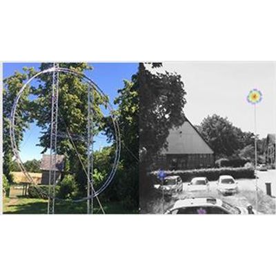 The acoustic camera with the special wind turbine microphone array suits perfect with its big diameter of 500 cm for very low frequency sound sources. The 40 microphones are making sound visible and are localizing noise exactly from 50 Hz. The optimized microphone distribution guarantees a perfect sound source localization and a high dynamic range. Although the system has a diameter of 500 cm dismounted it can be convoyed in a car. Setup time is about 30 min. Typical applications are wind power plants, industrial facilities and environmental measurement.