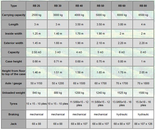 Rectangular pressed sheet steel chassis. Watertight case. Watertight rear door with automatic opening. Jib fastening adjustable 3 positions. Strengthened stand wheel. Knocking over until more than 60 degree. Parking brake. Hydraulic brake (RB 60and RB 80). Deflectors on rear door. Knocking over byflexible tube. Fixed and protected lights. Ladder (from RB 40 model).