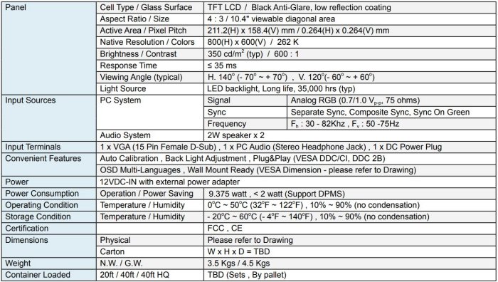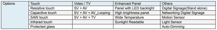 Modularize mechanical design provides flexible product configuration and easy maintenance. Optional build-in touch screen for interactive application. Available with auto-brightness sensor offers application in day and night. VGA connector with optional AV,SV,AV-l_ooping Complete custom design/solution for OEM customers.