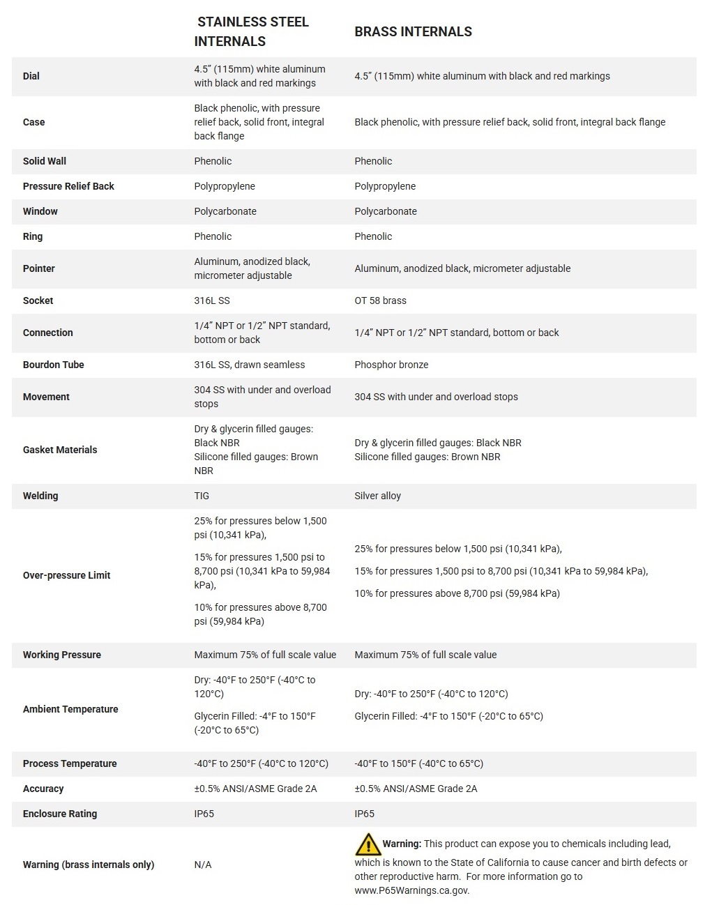 Solid phenolic front and polypropylene pressure relief back safety case. Field liquid-fillable (bottom connection only). ±0.5% accuracy. Stainless steel full rotary movement for longer life. Micrometer adjustable pointer for ease in calibration. Under and overload stops. 316L stainless steel, brass or Monel® wetted parts. Restricted orifice standard on dual scale (optional on single scale). ASME B40.100 compliant. RoHS compliant (SS and Monel® internals only). CRN registered. 5 year warranty.