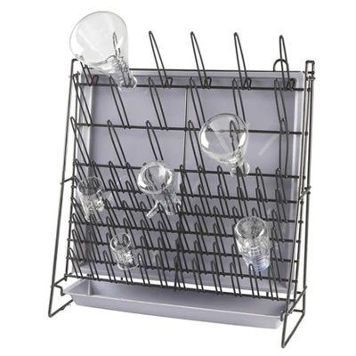 Save glassware from chips and cracks! VEE GEE Wire Drying Rack is a versatile self-standing draining and drying fixture that can be used on a table, by a sink, or easily mounted on the wall (mounting hardware not included). Designed with eighteen 5" (127mm) tall pins and seventy-two 3" (76mm) tall pins, it holds up to 90 pieces of glassware including beakers, flasks, bottles, and more. Durably constructed, the drip tray and back are made from polystyrene while the pins are spot-welded, vinyl-coated steel wire for extra durability. Bottom drainage tray conveniently slides out for easy emptying. Drying rack dimensions are 18.2"L x 7.4"W x 20.7"H (46.2 x 18.2 x 52.5 cm).