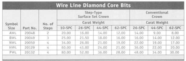 Diamond bits are stocked in standard sizes. The chart shows basic part numbers and diamond carat size. Four diamond grades are available as well as special features such as extra hard matrix, tungsten hard facing, and reinforced waterways. Many other competitive features are available on request. Consult Acker price lists for details...Please specify step-type or conventional crown.
