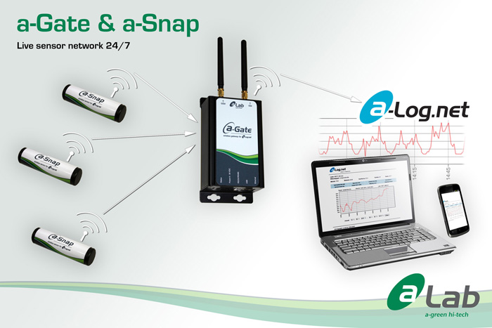 a-Gate is an Gateway device that receives data from a-Snap dataloggers (and other sensors). a-Gate and a-Snaps create an wireless monitoring network that is logged and sent to a-Log.net (A Measurement Data Portal for a-Lab Customers).