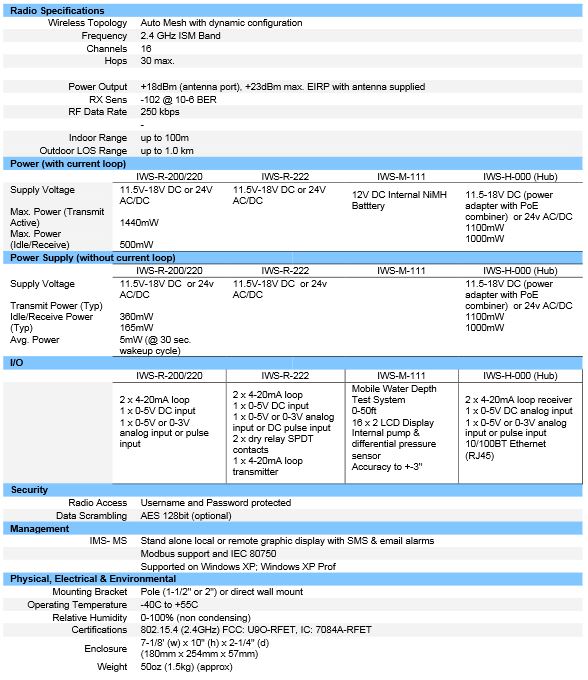 A network of IWS nodes can scale to over 1000 nodes and be supported by one or more IWS Hubs. In addition to the basic IWS node supporting up to 4 standard SCADA inputs, several variants are available, offering output controls through either dry relay and 4-20mA current transmitter to facilitate motor or other analog peripheral controls