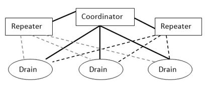 The mesh topology used by ChemiGreen enable each drain to communicate with the coordinator using any other available unit on route. This means that a drain can talk either directly to the coordinator or via a repeater. This is done automatically and increases system robustness.