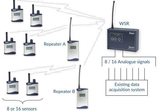 - Up to 16 sensors` values (e.g. temperature, humidity, light, voltage or current) are presented as corresponding 0-5VDC or 4-20mA outputs on the WSR receiver, allowing quick, easy and accurate connection to existing data gathering systems.