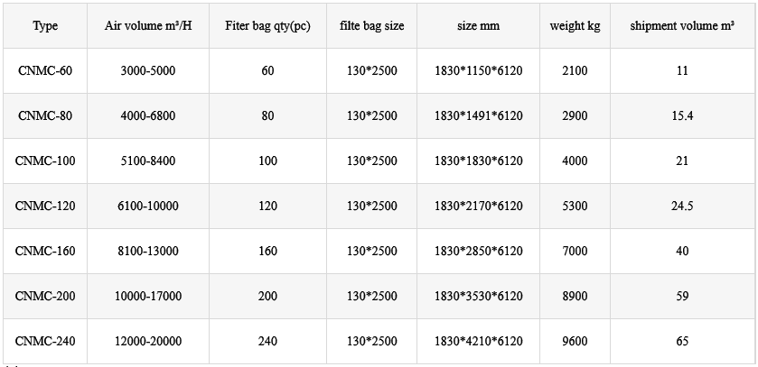 The CNMC bag filter has a relatively simple structure and a smaller footprint compared to other pulse cleaning filtration systems.