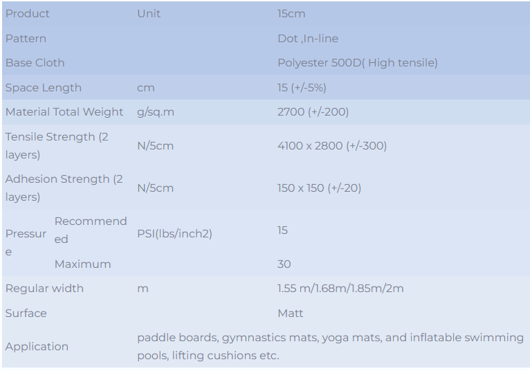 The double wall fabric is mainly used in outdoor leisure and sports fields such as paddle boards, gymnastics mats, yoga mats, and inflatable swimming pools, lifting cushions etc.
