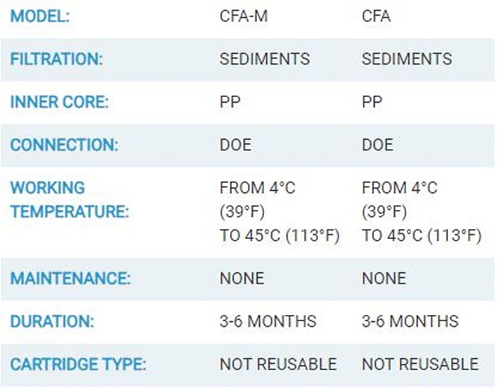 CFA cartridges are produced with FDA-compliant 100% non-toxic polypropylene thread, suitable for drinking water. Its different degrees of filtration make it effective in reducing and removing sand, rust, silt, flakes and suspended sediments. In addition, the filter media chemically resists a wide range of fluids such as: concentrated acids, strong oxidising agents, other corrosive fluids and gases.