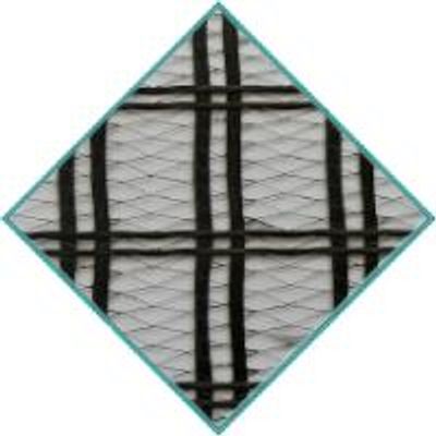 The woven geogrid manufactured from high strain, EVA/AC coated glas yarns and a polyester mesh for asphalt applications.