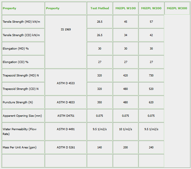 The above values are effective from 01 – 08 – 2009. The values are average roll values in which all the properties are having -10% tolerances. Water Permeability, Elongations are having -30% tolerance and AOS have + 30%. The information given in this data sheet is based on tests conducted at our in-house laboratory and independent accredited laboratories. While the information is presented as a true and accurate representation of the attributes of the products to the best of our knowledge, no expressed or implied warranties are made and Maharshee Geomembrane Pvt. Ltd. assumes no responsibility or liability with regard to the use of this information. The right to make periodic revisions of the specifications without prior notice is reserved.