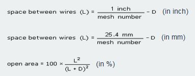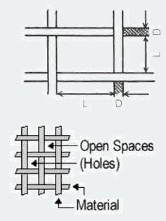 The aperture opening expresses the open area of the cloth. Wire Mesh contains open spaces (holes) and material. Open area is the total area of the holes divided by the total area of the cloth and is expressed as a percent. In other words, open area describes how much of the wire mesh is open space. This parameter can be calculated by means of the mesh number and the thickness of wire (D). With these two information is it possible to obtain the space between the wires and the open area for every existing mesh number.