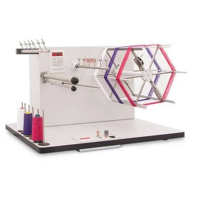 Wrap Reel Machine, to measure skeins of yarn of a pre-determined length and number of turns for count and strength testing. 1 Metre, 36″ or 54″ circumference collapsible swift (specify). Wrap reel Complete with yarn package stand and pre-tension device, fitted with a pre-determined counter.