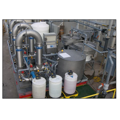 AquaTex™ Ultra use a five-stage treatment process: prefiltration, nanofiltration, advanced oxidation, ultrafiltration, and ultraviolet chamber. The reclamation process begins by first collecting the wastestream and passing it through a 10-micron vibrating shaker screen and then through 5-micron tubular backwash filters for loose particle separation. The number of additional backwash filters is dependent on the size and content of the wastestream. The filtrate then flows through an advanced proprietary oxidation reactor and then through a ceramic ultrafiltration membrane to reduce particles to less than a 0.01 micron level. The final stage is complete disinfection in a ultraviolet chamber. Treated wastewater may then be discharged, recycled or reused.