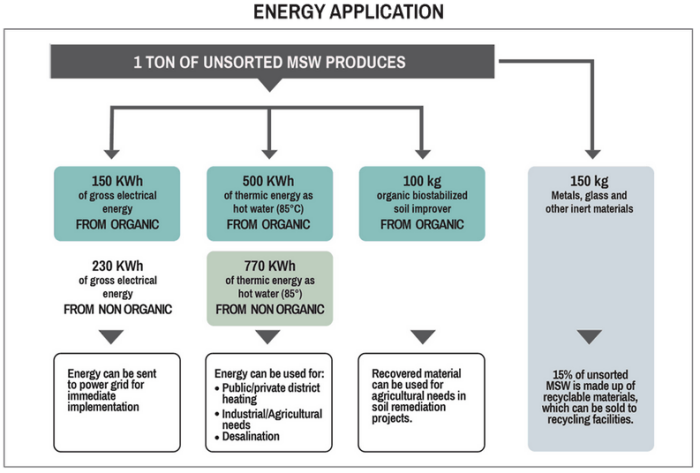 All values indicated above are based on a standard tonnage of European MSW: 45% dry waste, 40% organic waste and 15% recyclable metals/inert materials.