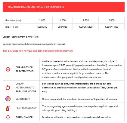 This type of impregnators (APV model) is used for the treatment of wood in class of use 4 (according to UNI EN 335-1), that is. wood treated with these systems can be put in permanent contact with soil and fresh water.