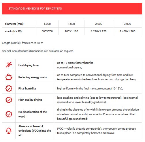 The ESV dryer is the most suitable model for sawmills, for drying boards up to 100 mm thick, both in soft wood (fir, pine, larch, etc.) and hard wood (oak, walnut, chestnut, ash, maple, etc.).