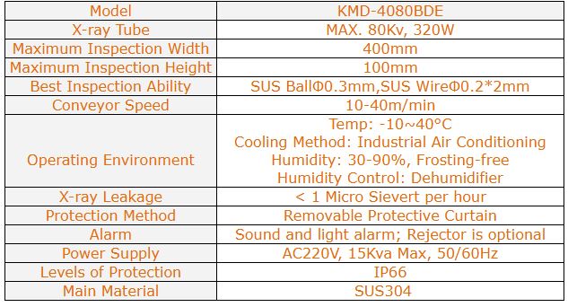 instance, it is suitable for inspecting the residual collarbones, fan rib, shoulder blades etc in chicken. X-ray Inspection System KMD-BDE Series: Compared with traditional single-energy inspection, KMD-BDE series applies to dual-energy X-ray inspection technology, achieving higher sensitivity and inspection rate. KMD-BDE series can identify foreign bodies such as rubber, bone with near density. Without effect caused by irregular and overlap.