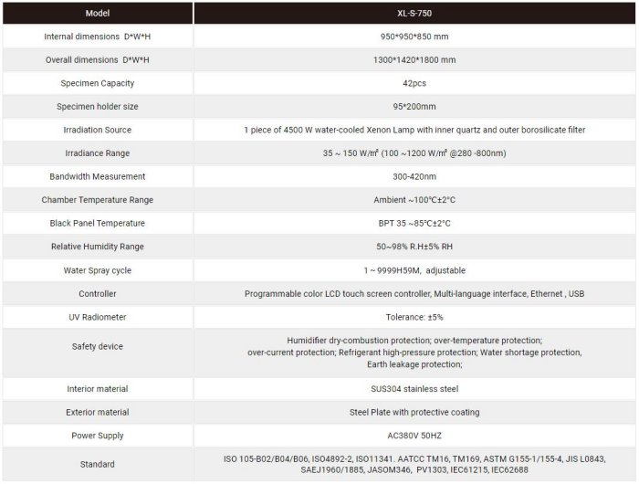 XL Series xenon weathering test chamber can place 42 pieces of specimens, are upgrade to programmable controller and Ethernet access. Their reliable performance and low purchase price make these products very competitive.