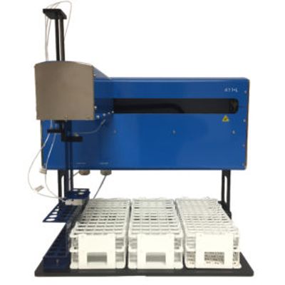 The 411L is for labs with higher volumes of samples. Many of its features include: A separate standards/calibrant rack that reduces time spent on pouring standards. A traveling wash station to reduce travel time between WASH and Sample, thereby reducing wear and tear on the components. Integrated WASH and WASTE Pumps. Up to three sample-rack positions with up to 270 sample positions. Compatibility with an optional diluter (412 Dilutus below), which can automatically dilute off-scale samples and allow the user to create standards/calibrants online.