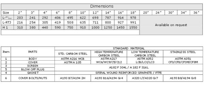 Design according to ANSI B 16.34. Full range of body and screen materials. Bolted cover. Flanges according to ANSI B 16.5 from 2` to 24` Flanges according to ANSI B 16.47 from 26` Bw ends according to ANSI B 16.25 Face to face according to ANSI B 16.10 Standard screen perforation 1,5 mm round holes other perforation or wire cloth available on request. Rabot btween filtering area and piping section minimum S Testi ng accordi ng to API 598, BS EN ISO 12266 PART 1.