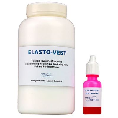 Elasto-Vest Resilient Investing Compound helps in the "break-out" of your acrylic denture work. Elasto-Vest coats, protects and safeguards during the devesting process. For use on acrylic, porcelain & composite teeth.