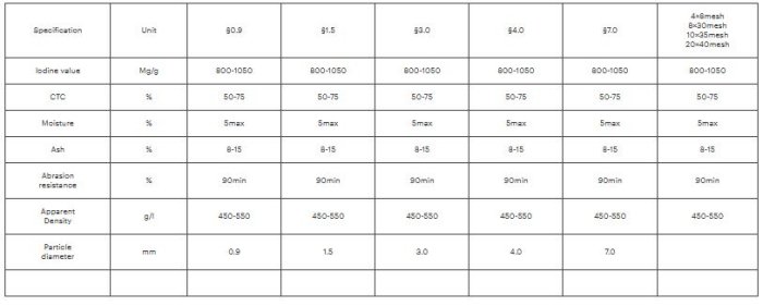 8. Catalyst in Metallurgical & Petroleum Refineries Parameters Item Coal Granular Activated Carbon Size 8*30, 12*40, 20*40mesh or customized Iodine 800 900 1000 BET 900 1000 1100 Moisture 5% (max) Ash 5% (max)   Hardness 95% (max)