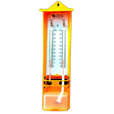 High Range Masons Pattern Hygrometer – Wet & Dry Bulb Hygrometer. Housed in a yellow plastic case with lid and bulb protection. Available in Red Spirit. Supplied with Hygrometric tables, spare wick and instructions. Sold singles. Spare wick can be purchased through the Sales Office. Product Code: P2506 – Red Spirit -5°C/+100°C High Range.